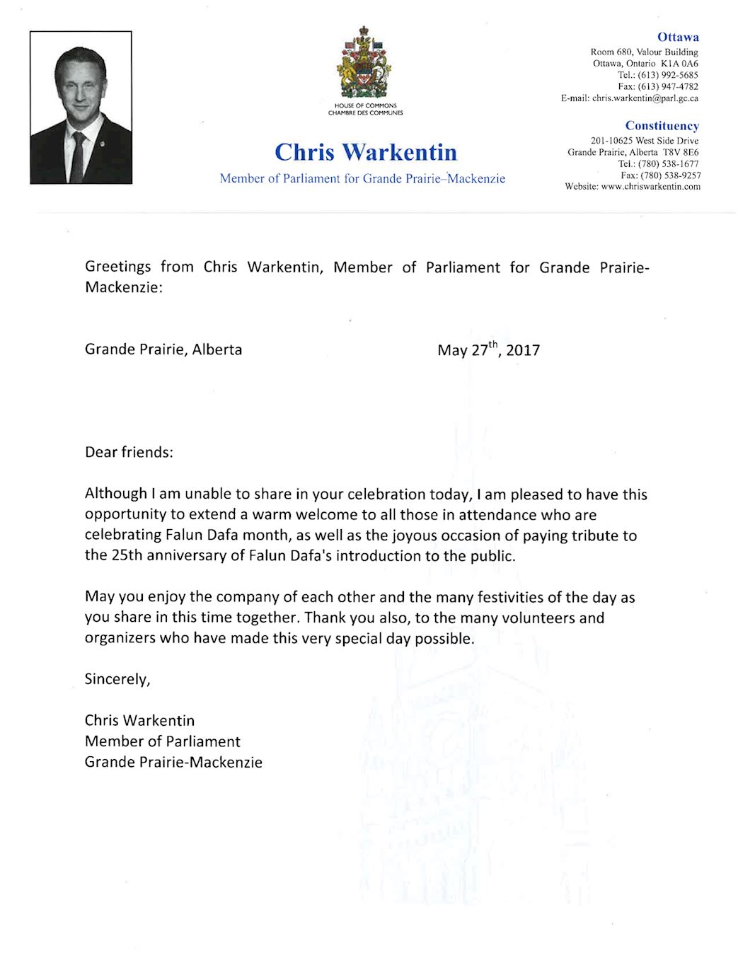 ![]() 圖2:大草原市國會議員克里斯﹒沃肯庭為法輪大法洪傳25週年發來賀信 |