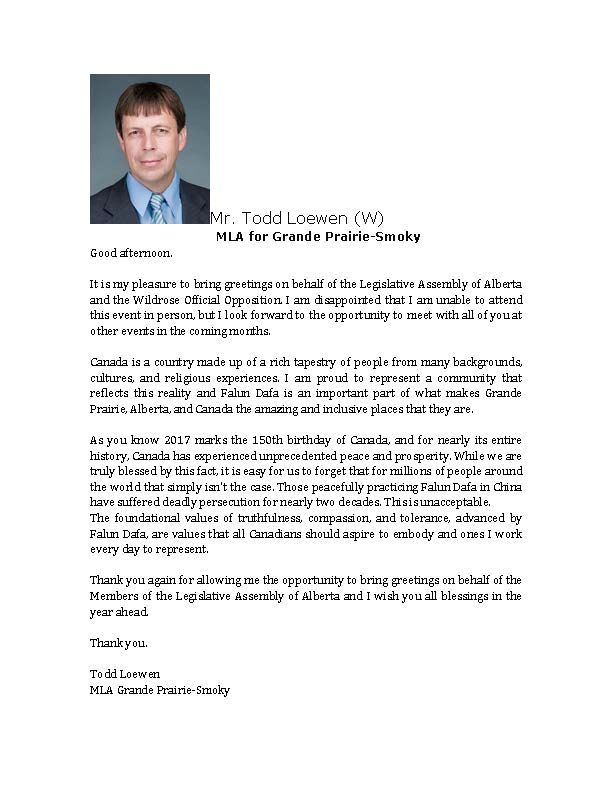 我很高興代表阿伯塔省立法會和野玫瑰官方反對黨致以問候。很遺憾我無法親自參加這個活動,但是我期待在未來的幾個月的其他活動中有機會跟大家見面。