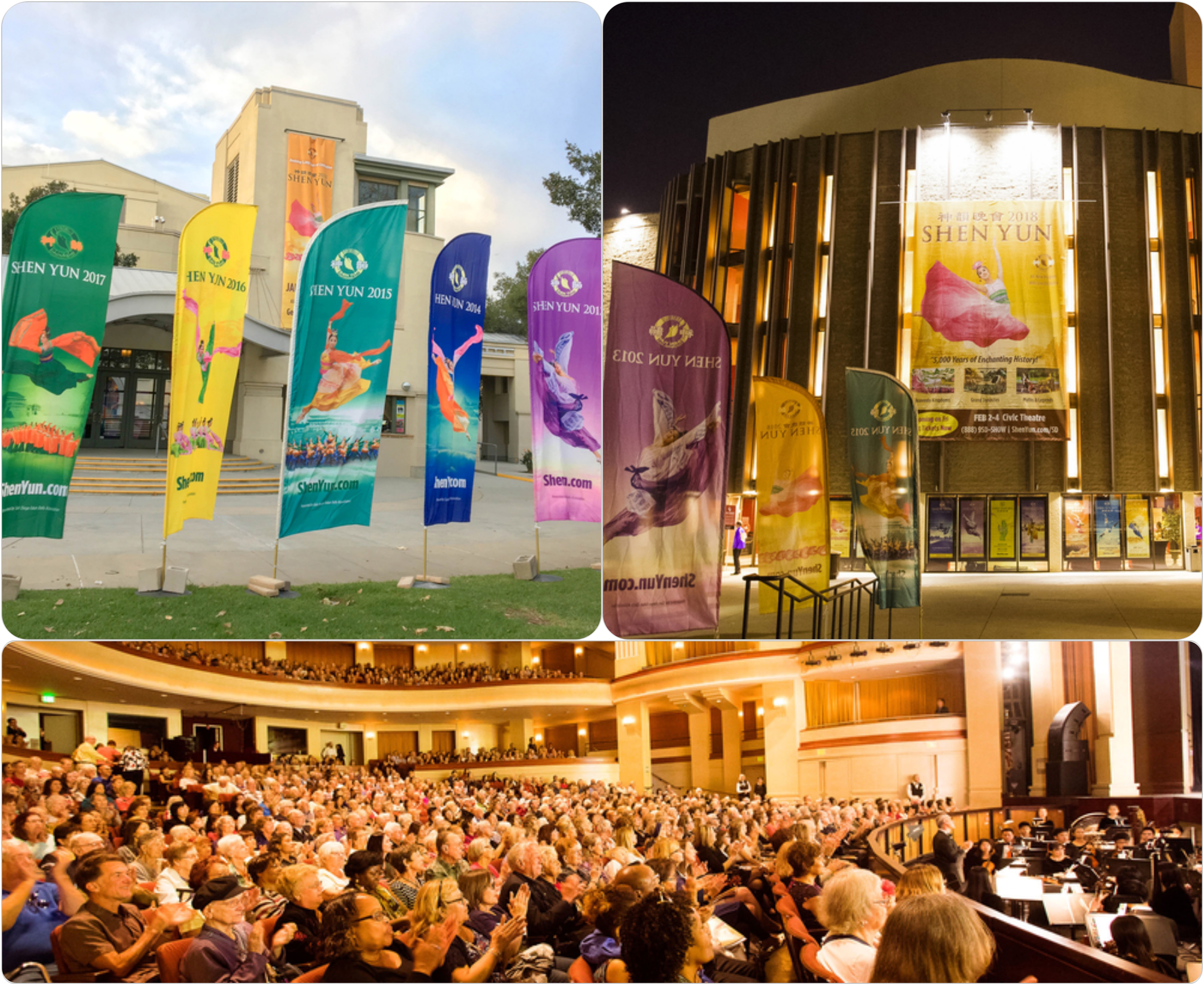 ![]() 二零一八年一月三十日至二月四日,神韻紐約藝術團在美國西部著名海港城市──聖地亞哥地區的二個劇院共上演了七場演出均爆滿。上左:加州藝術中心(California Center for the Arts, Escondido);上右:加州聖地亞哥市政劇院(San Diego Civic Theatre)。下圖: 一月三十日晚,神韻在加州藝術中心大爆滿的盛況。 |