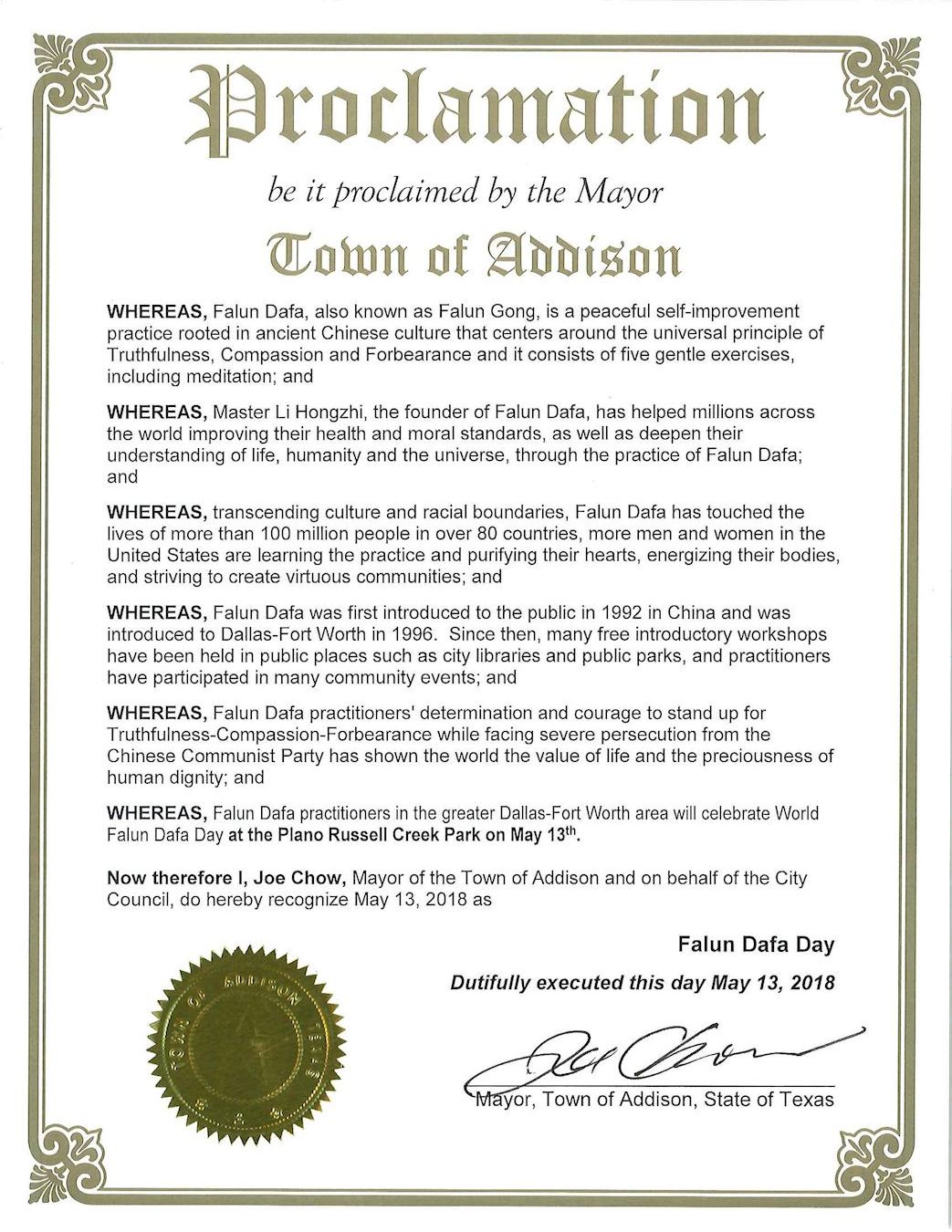 鑑此,我,周建源(Joe Chow),艾迪遜市市長,代表市議會宣布二零一八年五月十三日為「法輪大法日」
