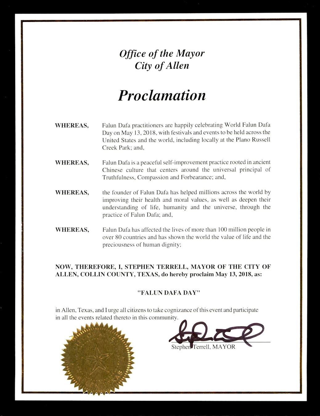 因此,我,斯蒂芬?特雷爾(Stephen Terrell),艾倫市市長宣布二零一八年五月十三日為「法輪大法日」