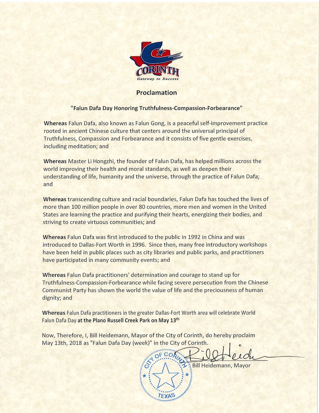 鑑此,我,比爾•海德曼(Bill Heidemann),科林斯市市長,宣布二零一八年五月十三日為科林斯市「法輪大法日(周)」。