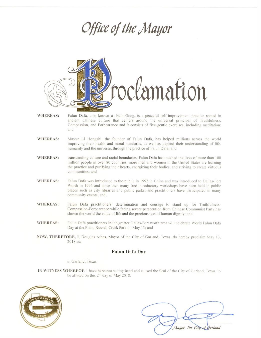 鑑此,我,道格拉斯•阿塔斯(Douglas Athas),嘉蘭市市長,宣布二零一八年五月十三日為德州嘉蘭市「法輪大法日」。