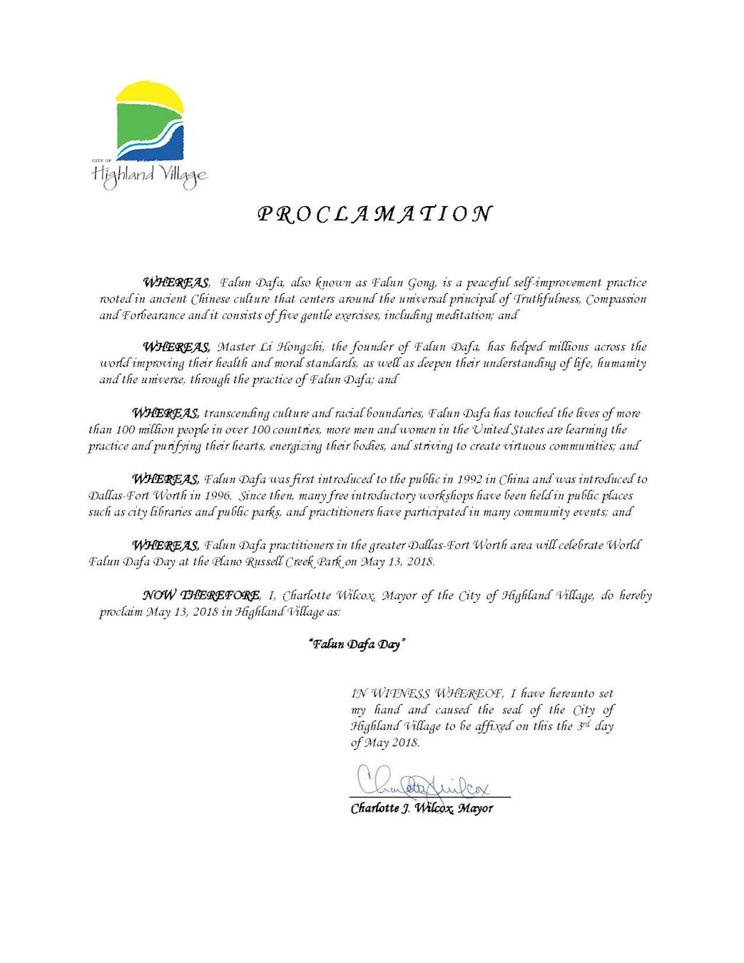 鑑此,我,夏洛特•威爾科克斯(Charlotte Wilcox),高地村市市長,宣布二零一八年五月十三日為德州高地村市「法輪大法日」。