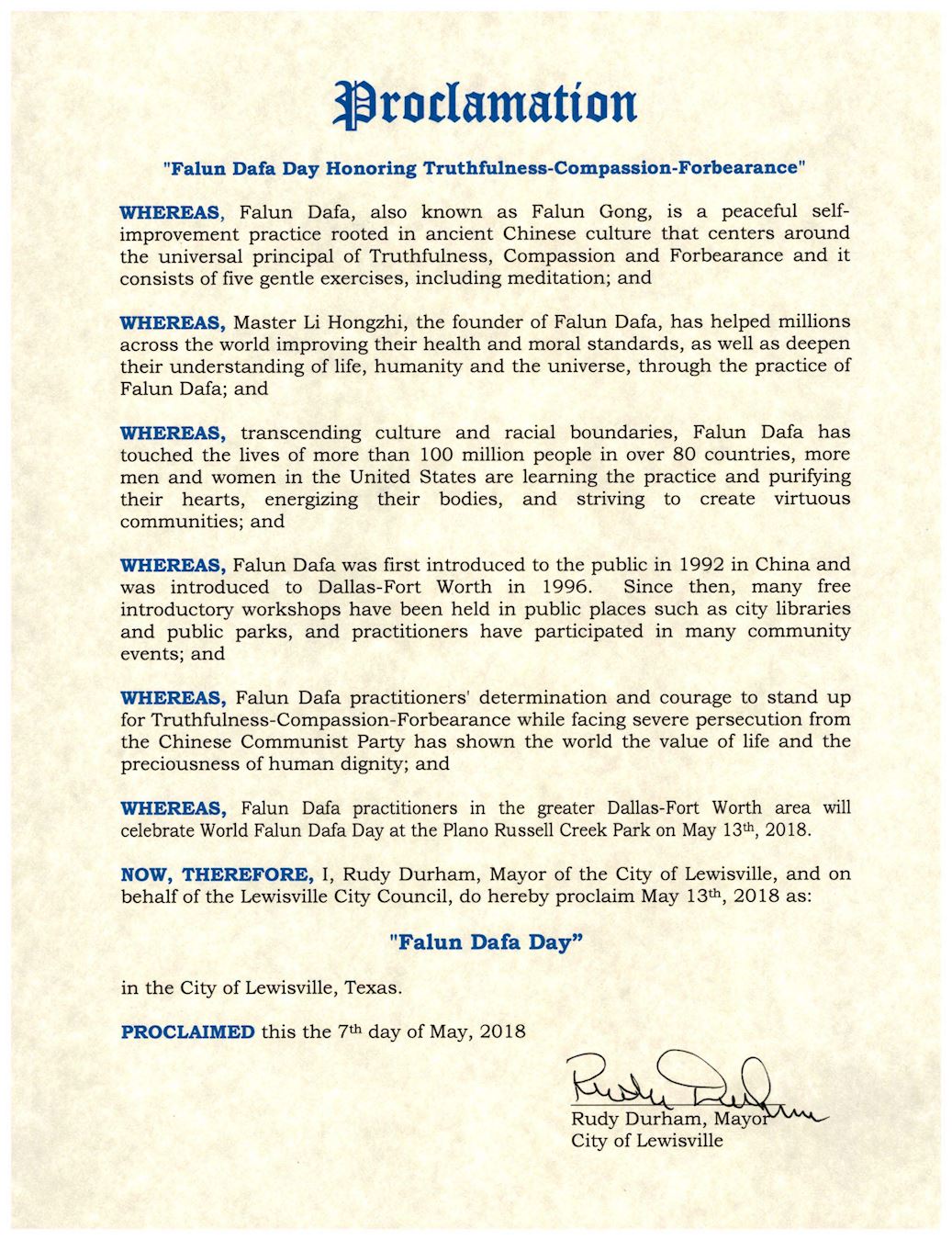 鑑此,我,魯迪•達勒姆(Rudy Durham),路易斯維爾市市長,宣布二零一八年五月十三日為德州路易斯維爾市「法輪大法日表彰真、善、忍」。