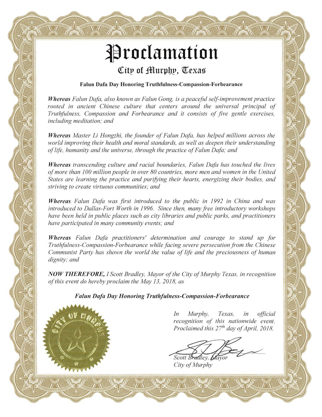 鑑此,我,斯科特•布蘭德裏(Scott Bradley),墨菲市市長,宣布二零一八年五月十三日為德州墨菲市「法輪大法日表彰真、善、忍」。
