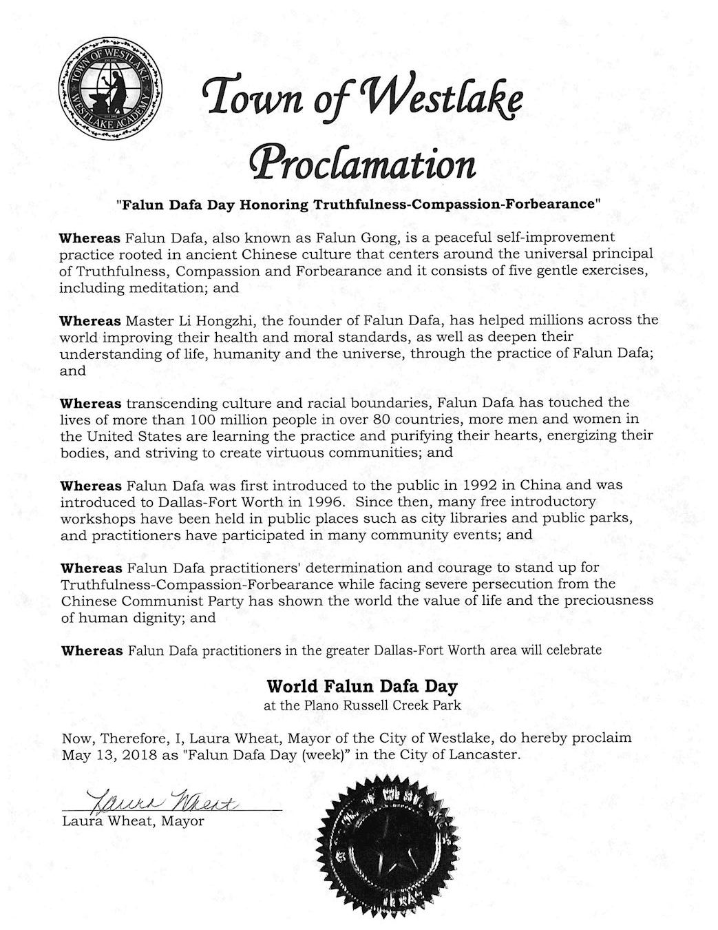 鑑此,我,勞拉?惠特(Laura Wheat),西湖市市長,宣布二零一八年五月十三日為德州西湖市「法輪大法日(周)」。
