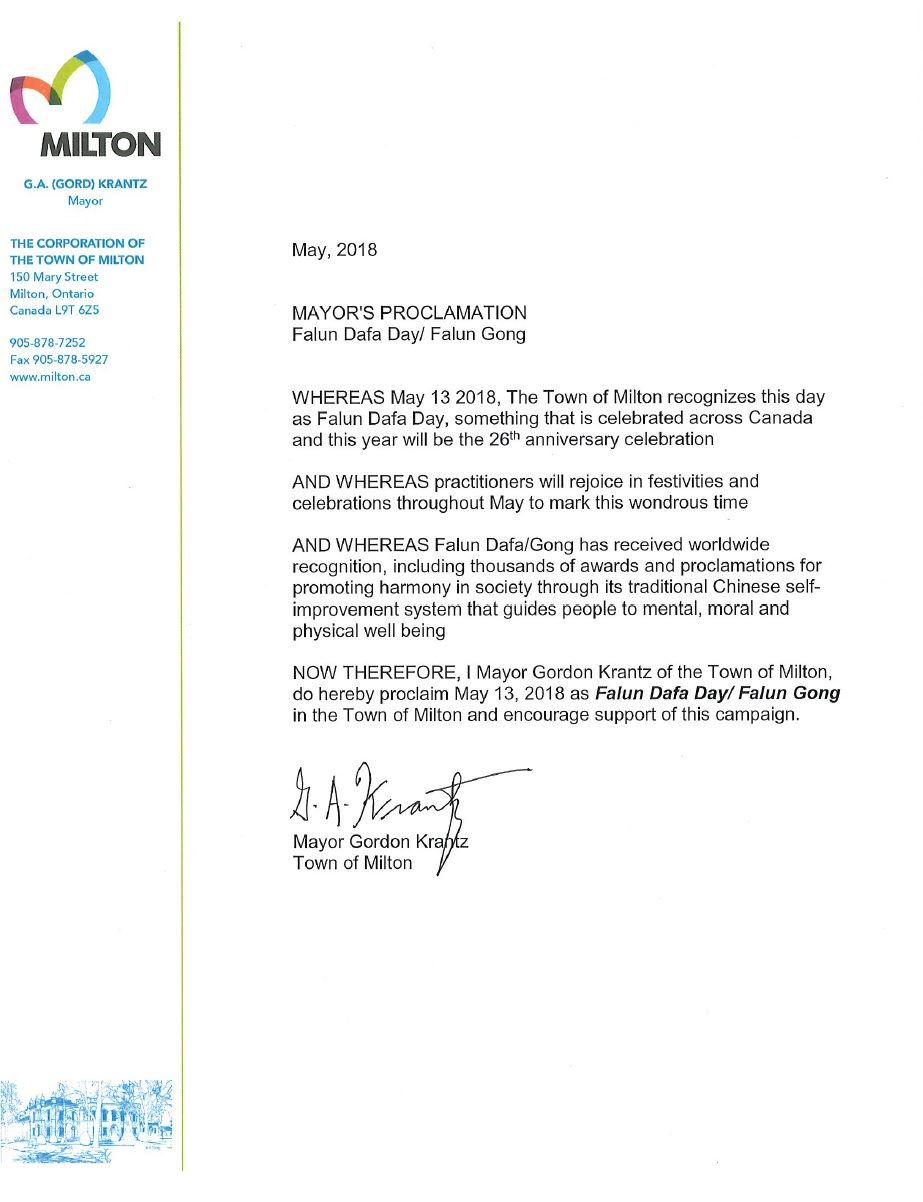 安省米爾頓(Milton)市長克蘭茨(Gordon Krantz)宣布2018年5月13日為米爾頓法輪大法日,並褒獎法輪大法。