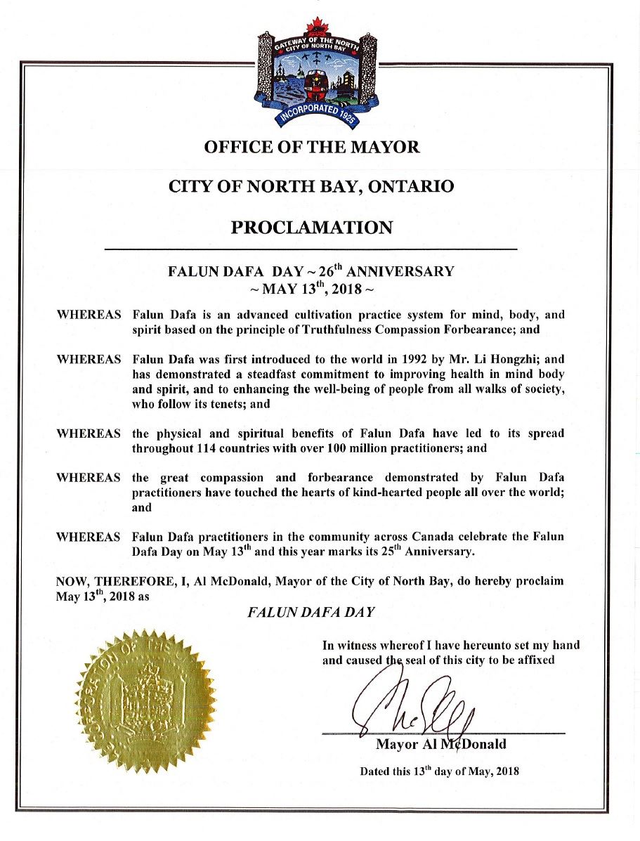 安省北灣(North Bay)市長Al McDonald宣布2018年5月13日為法輪大法日。
