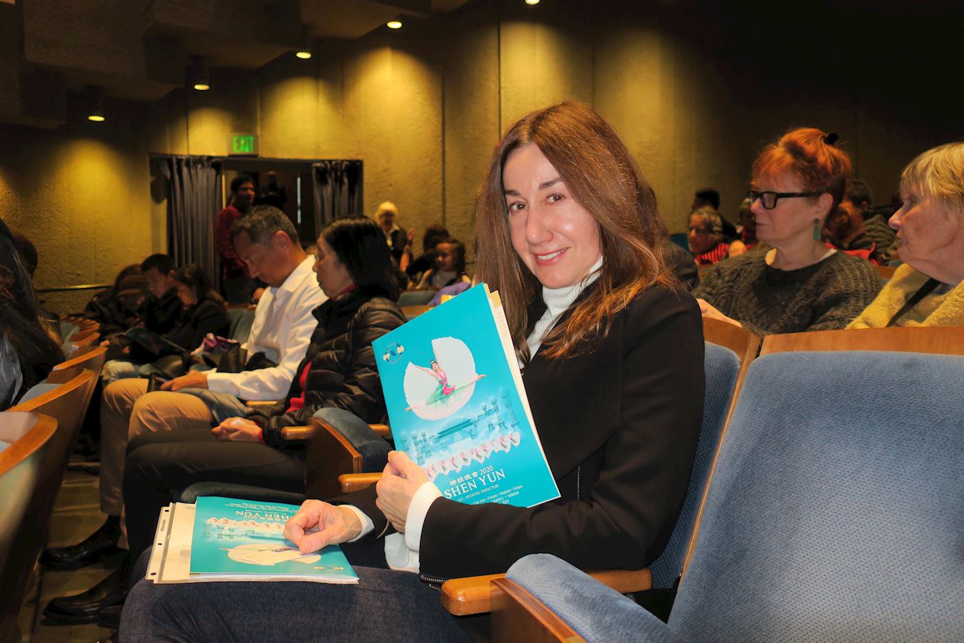 ![]() 圖4:二零一九年十二月二十二日下午,加州大學伯克利分校教授安娜﹒貝萊紮(Anna Bellezza),觀賞了神韻環球藝術團在加州大學伯克利分校澤勒巴克館的演出。 |