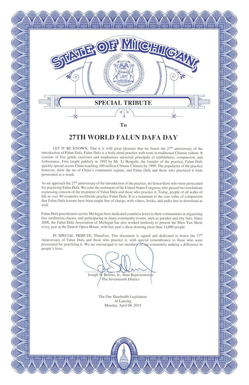 來自密西根州第十七選區的州議會眾議員約瑟夫﹒貝利諾(Joseph N. Belino, Jr)在褒獎信中說:「法輪大法的創始人李洪志先生於一九九二年首次公開傳授法輪大法。到一九九九年,在中國的學員人數迅速增加到一億人。然而,這種功法的普及卻引起了中共政權的憤怒。 法輪大法的學員因此受到了殘酷的迫害。」