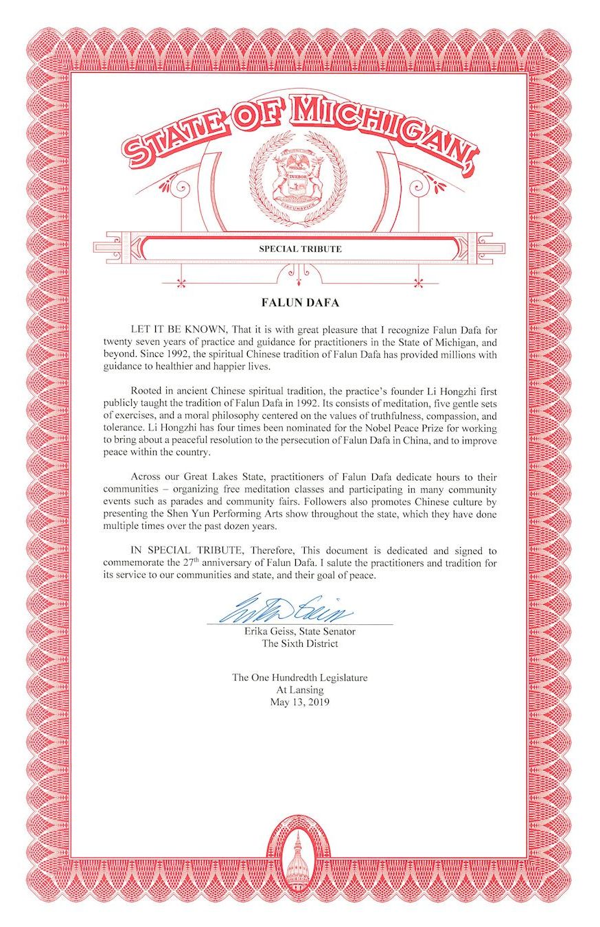 來自密西根州第七選區的參議員戴娜﹒博汗基(Dayna Polchanki)和第二十選區的眾議員和馬特﹒克力紮(Matt Kolcszar)在他們共同署名的褒獎信中說:「我們為能加入慶祝法輪大法(也稱法輪功)傳法二十七週年感到高興和榮幸。自一九九二年以來,這種來自中國的高德大法已幫助了世界範圍內,上億人過上了更幸福和健康的生活。」褒獎信中還提到:「法輪大法教導學員通過同化宇宙的最高特性真、善、忍,以增強身心健康。儘管法輪大法教導學員向內找,達到他們內心世界的轉變,但這種轉變的結果和影響卻是向外的,即對外部世界產生了積極的影響。「