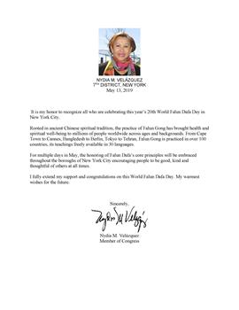 紐約州第七選區國會議員納迪亞﹒委拉斯開茲(Nydia M. Velazquez)發來賀信,表示:「我很榮幸地表彰所有正在紐約市慶祝今年第二十屆世界法輪大法日的人」。