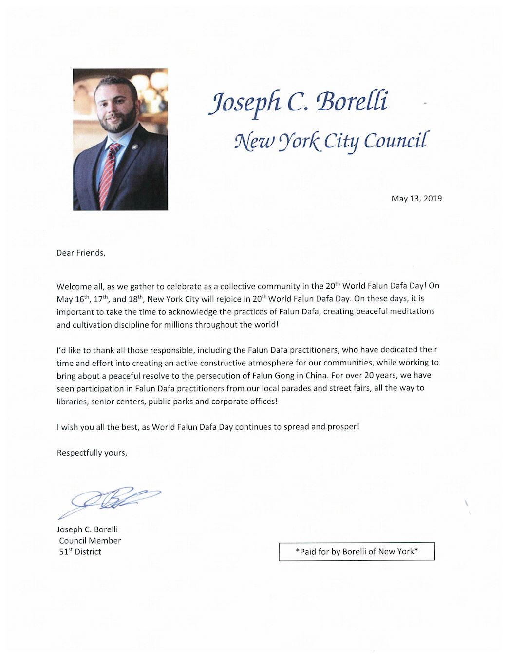 紐約市第五十一選區市議員約瑟夫﹒博雷利(Joseph C. Borelli)發榮譽證書和賀信祝賀第二十屆法輪大法日,鼓勵更多人了解法輪大法。