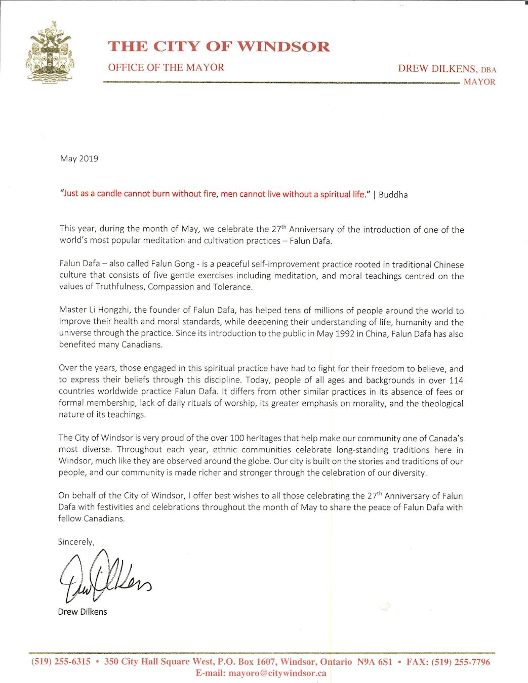 ![]() 圖1:Anniversary of Falun Dafa - Mayor Drew Dilkens Letter:加拿大溫莎市市長德魯﹒迪爾肯斯(Drew Dilkens)的賀信 |