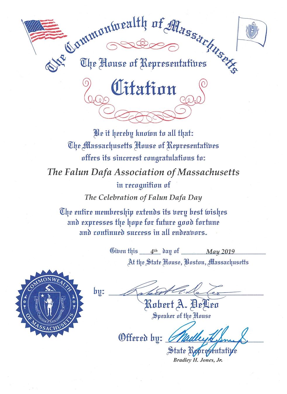 褒獎狀中說,麻薩諸塞州眾議院向麻薩諸塞州的法輪大法學員們致以最誠摯的祝賀。眾議院全體議員向你們致以良好的祝願,並祝福你們未來繼續好運、成功。