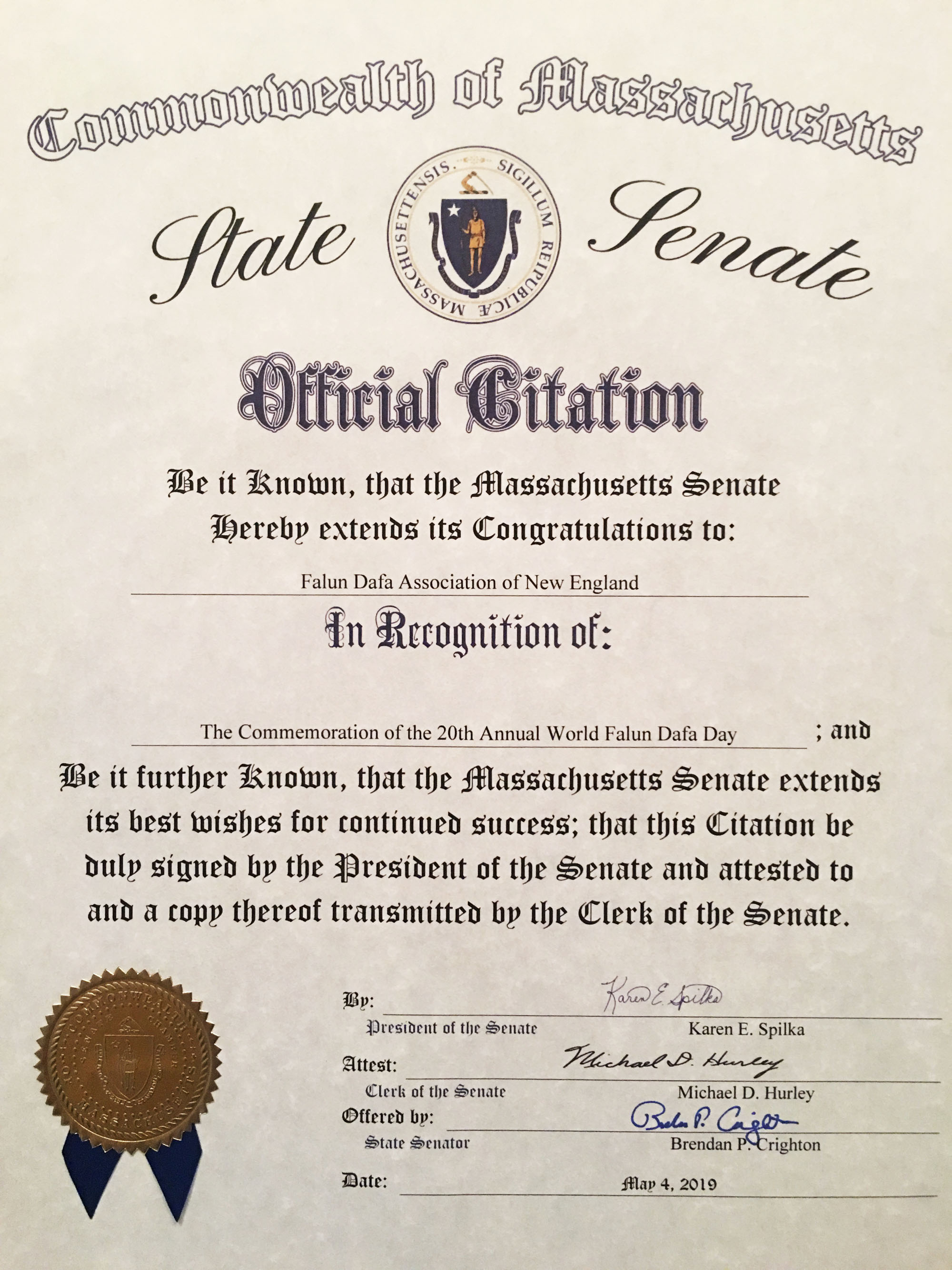 褒獎狀中說,值此二零一九年世界法輪大法日之際,麻薩諸塞州參議院謹向新英格蘭法輪大法學會表示祝賀。麻薩諸塞州參議院並祝法輪大法學會繼續成功!