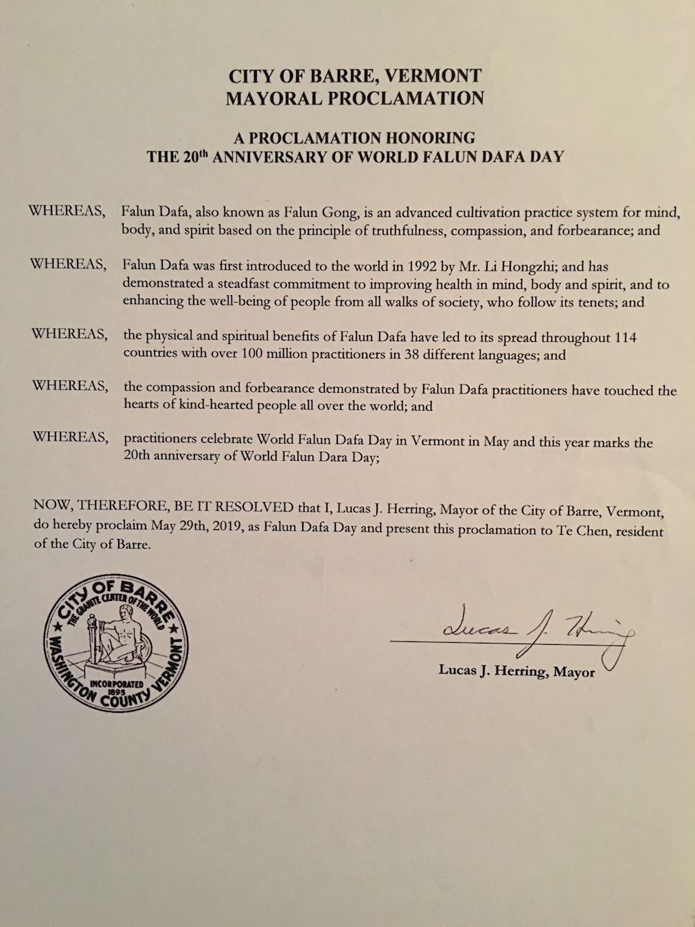 鑑此,我,盧卡斯﹒何瑞,巴爾市長宣布二零一九年五月二十九日為佛蒙特州巴爾市的「法輪大法日」