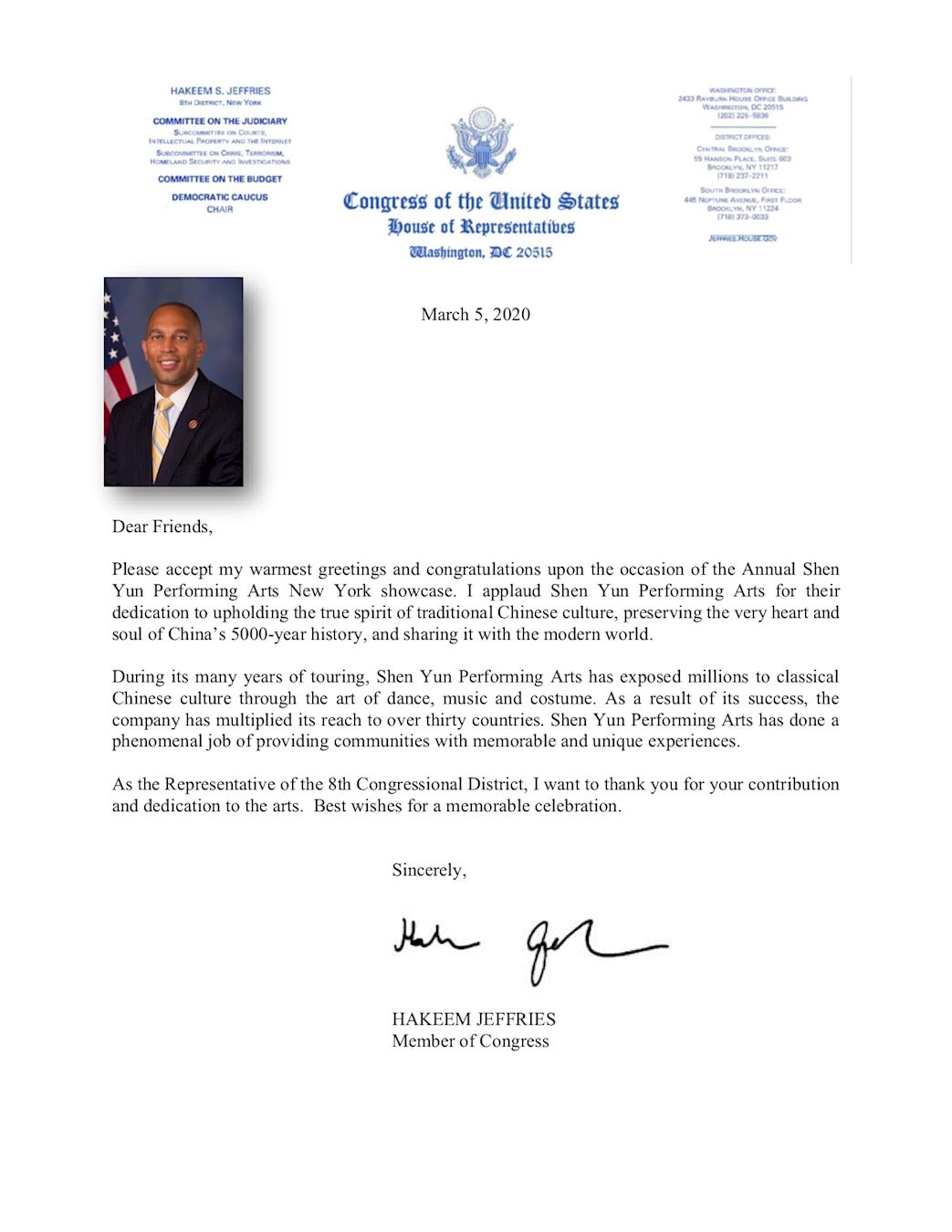 美國國會眾議員傑弗里斯(Hakeem S. Jeffries)在賀信中說:「神韻藝術團致力於維護真正的中華傳統文化,堅持中國五千年歷史的靈魂,並與現代世界分享,我對此讚賞不已。」