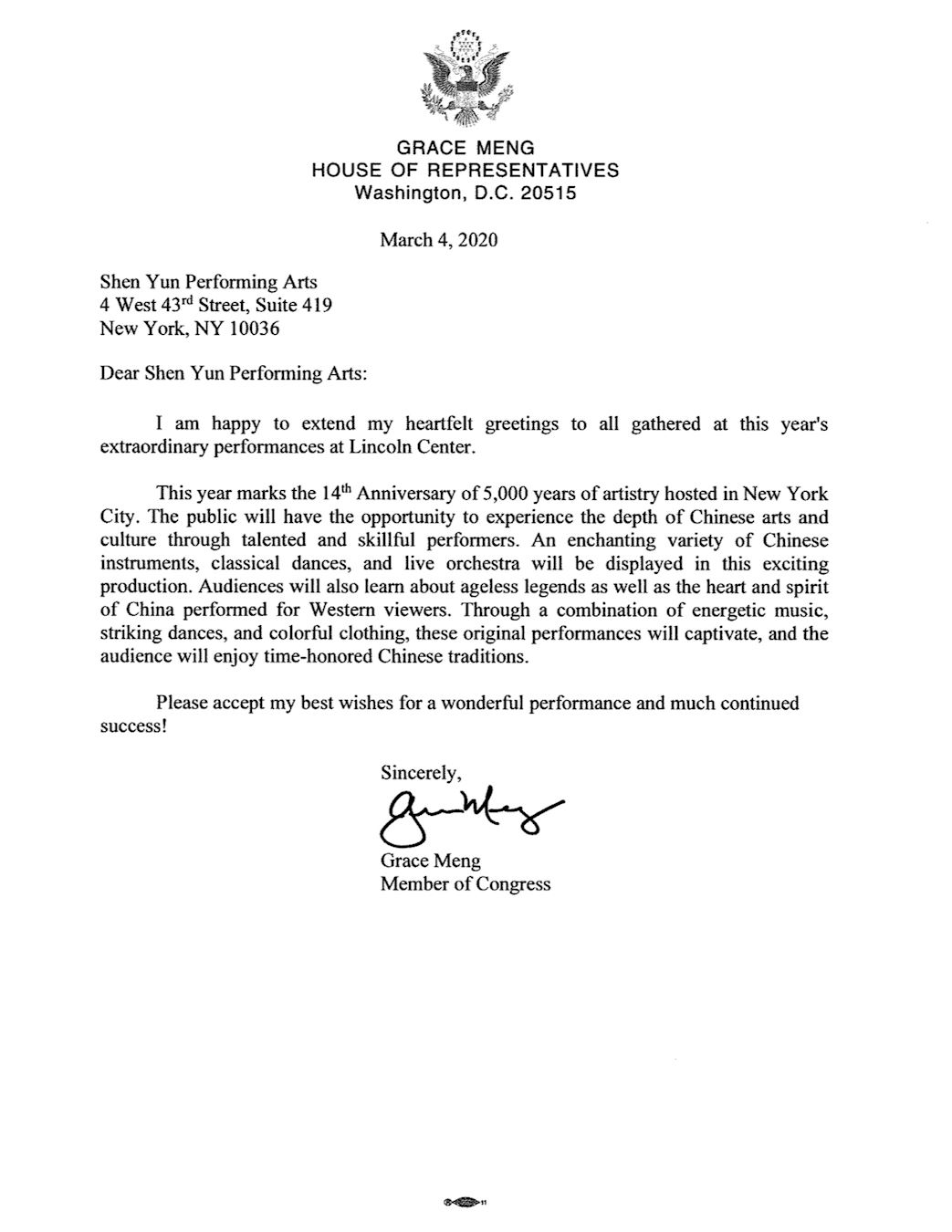 「我衷心向在林肯中心演出的所有人致以最誠摯的問候。」美國國會眾議員孟昭文(Grace Meng)在賀信中寫道:「今年是(神韻)在紐約市舉辦5000年藝術創作的十四週年。觀眾將有機會通過觀賞才華橫溢的藝術家表演,來體驗中華藝術與文化的深邃內涵。」
