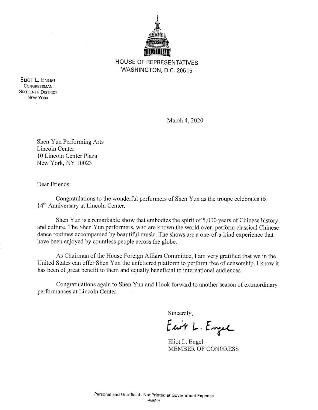 恩格爾說:作為眾議院外交事務委員會主席,我非常高興美國可以為神韻提供一個不受審查的自由平台,我知道這(自由)對神韻和國際社會的觀眾都是有好處的。再次恭喜神韻,我非常期待新演季!