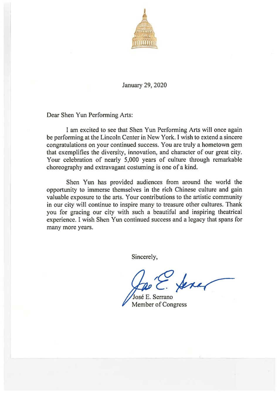 美國國會眾議員塞拉諾(Jose E Serrano)說:「我很高興神韻藝術團將再次蒞臨紐約林肯中心,衷心祝賀您不斷取得成功。」