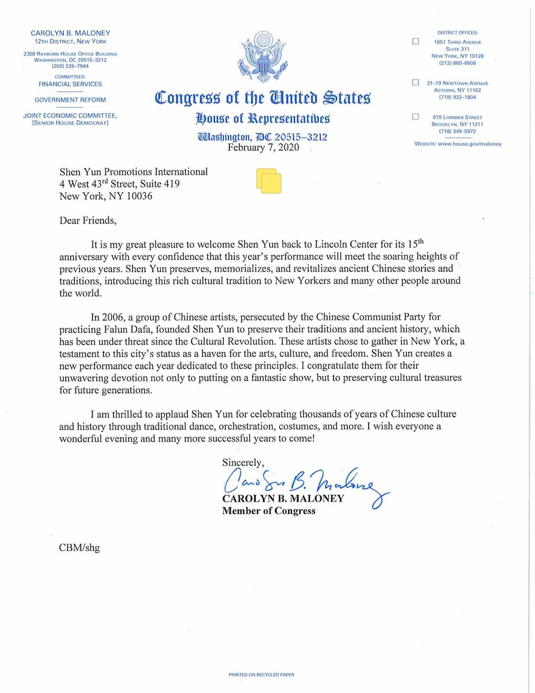 國會眾議員馬隆妮(Carolyn B. Maloney)在賀信中歡迎神韻重返林肯中心。她說:神韻保存、紀念和恢復中國古代故事與傳統,並將這種豐富的文化傳統介紹給紐約和世界各地的觀眾。