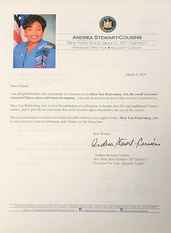 美國紐約州參議院多數黨領袖史都華-考辛斯(Andrea Stewart-Cousins)在賀信中說:「我很高興有此機會歡迎你們來到神韻藝術團──這個世界頂級古典中國舞和音樂團體。我很榮幸參與今晚的慶祝活動。」