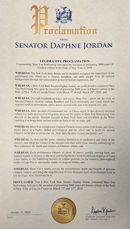 美國紐約州參議員喬丹(Daphne Jordan)在賀信中讚揚神韻藝術團:「通過美得驚人的舞蹈和音樂,神韻藝術家講述有關古代中國智慧、文化、佛家、道家以及價值觀的故事,這一切激勵了醫學創新,歌劇,舞蹈,建築,甚至武術(等行業)。」