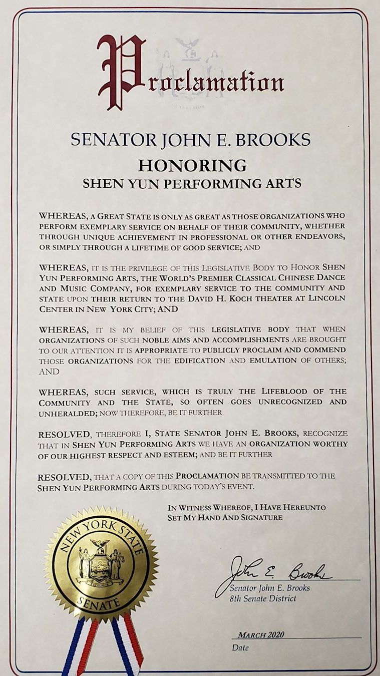 美國紐約州參議員布魯克斯(John E. Brooks)在賀信中說:「鑑於,這個議會有幸褒獎神韻藝術團──世界頂級古典中國舞和音樂團體,通過重返紐約林肯中心大衛寇克劇場,從而為社會和紐約州提供傑出服務;鑑於,我相信,當擁有如此崇高目標和成就的組織得到我們關注的時候,我們理應公開稱讚那些教化他人的組織;作為紐約州參議員,我表彰神韻藝術團是一個值得我們最高尊敬的組織。」