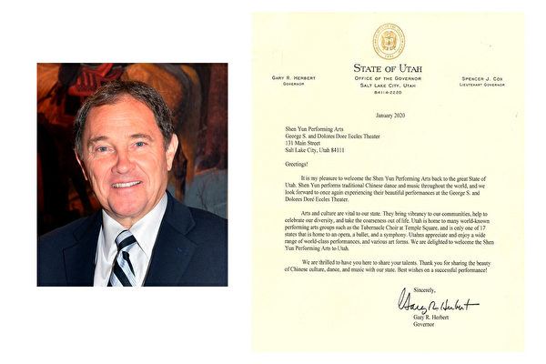 赫伯特在賀信中說:「我愉快地歡迎你們再次來鹽湖城。」他並說:「藝術和文化對猶他州至關重要。他們為我們的社區帶來活力,幫助慶祝我們的多元性,並幫助我們擺脫生活中的煩惱。猶他州是許多舉世聞名的演出藝術團體的所在地。猶他州民眾欣賞各種各樣的世界級演出。我們很高興歡迎神韻藝術團來到猶他州。」