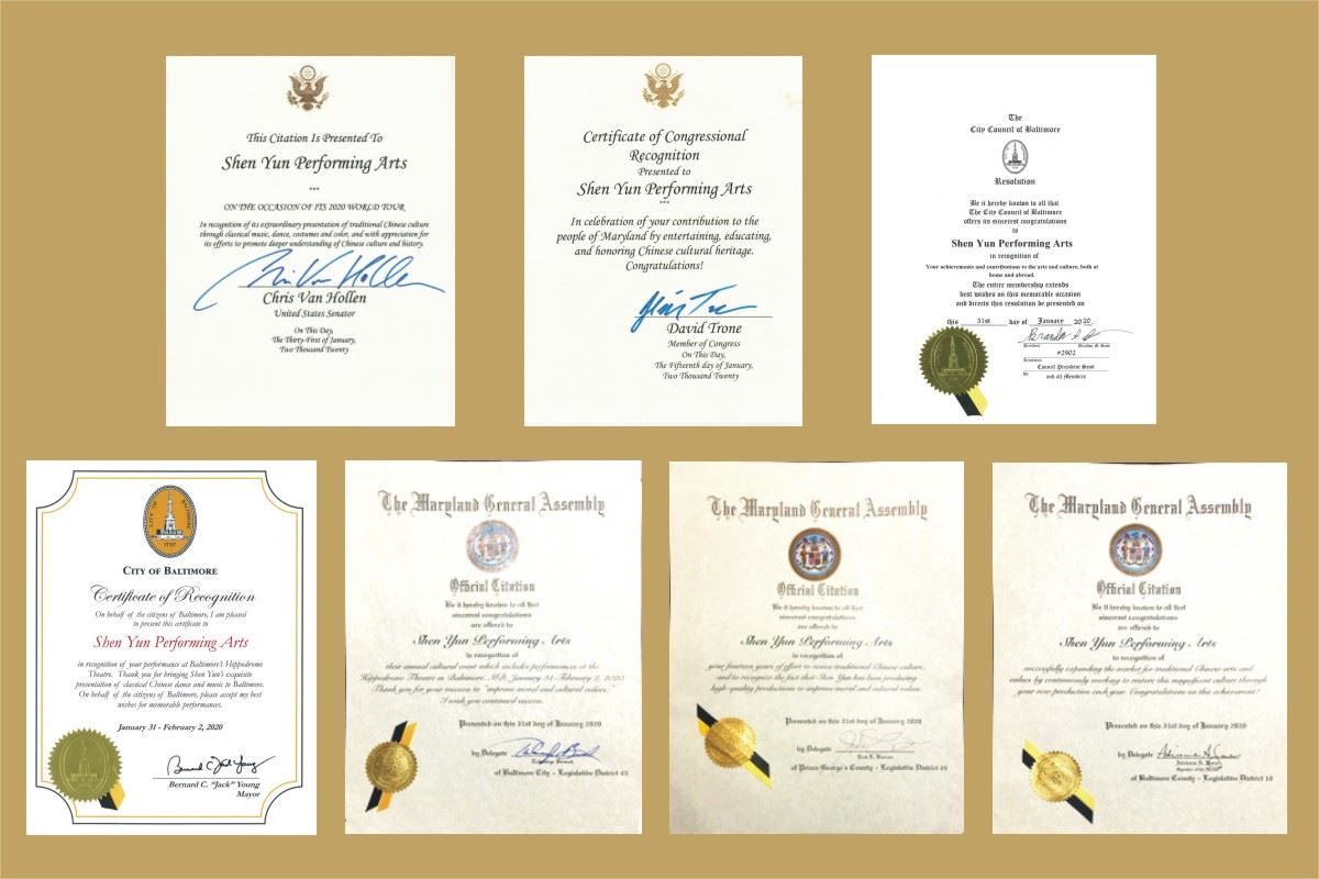 二零二零年一月三十一日至二月二日,神韻藝術團在巴爾的摩競技場劇院(The Hippodrome Theatre)上演了四場演出,馬裏蘭州的二十一位三級政要和巴爾的摩市議會通過決議案褒獎和祝賀神韻,其中包括美國聯邦參議員范浩倫(Chris Van Hollen)、國會眾議員特朗(David Trone),馬裏蘭州眾議院議長瓊斯(Adrienne Jones),州眾議員布蘭奇(Talmadge Branch)、巴倫(Erek Barron),巴爾的摩市長伯納德﹒揚(Bernard C. "Jack" Young)等。
