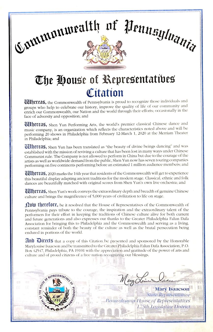 賓州眾議院在褒獎信中向神韻藝術家的「勇氣、靈感和非凡的才能表達敬意」,表彰「他們為現代及未來世世代代復興中華傳統文化所做的努力」,「並一直在不斷地提醒著中華傳統文化的美麗,以及在世界一些地方正發生著的殘酷迫害」。