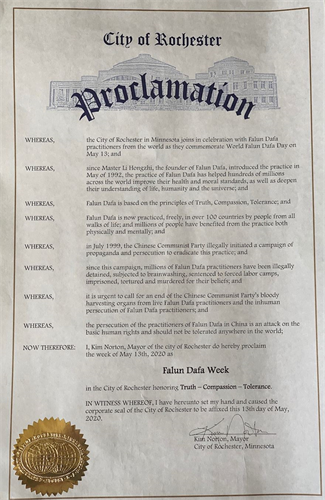 因此,現在,我,金姆﹒喏頓,羅切斯特市市長,為褒獎真、善、忍,宣布2020年5月13日這一週,為羅切斯特市市的法輪大法週。
