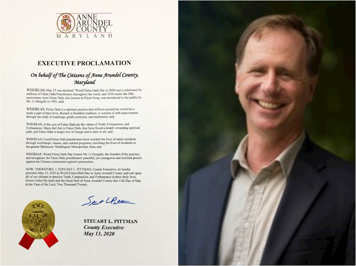 因此,我,斯圖爾特 L. 皮特曼郡長,宣布二零二零年五月十三日為安妮阿倫德爾郡「世界法輪大法日」,並呼籲所有民眾在他們的日常生活中實踐「真、善、忍」。