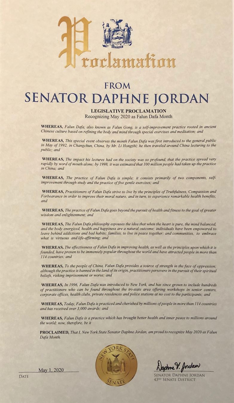 特此褒獎,我,紐約州參議員達芙妮﹒喬丹(Daphne Jordan)自豪的宣布,二零二零年五月為法輪大法月。