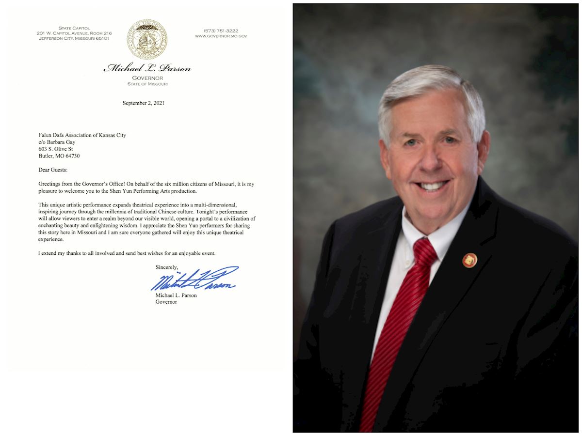 密蘇裏州州長邁克爾﹒L﹒帕森(Michael L. Parson)在賀信中代表州辦公室和該州六百萬公民問候所有觀眾,預祝他們享受到獨特的演出。他寫道:「(神韻)獨特的藝術演出將劇院體驗擴展為一場多維時空、啟迪心靈的中國傳統文化之旅。今晚的演出將引領觀眾進入超凡的境界,並打開通往美麗迷人且啟迪智慧的文明之大門……我確信到場的每個人都會享受這一獨特的劇院體驗。」帕森最後向所有參與演出者表示感謝,並祝願三場演出圓滿成功。