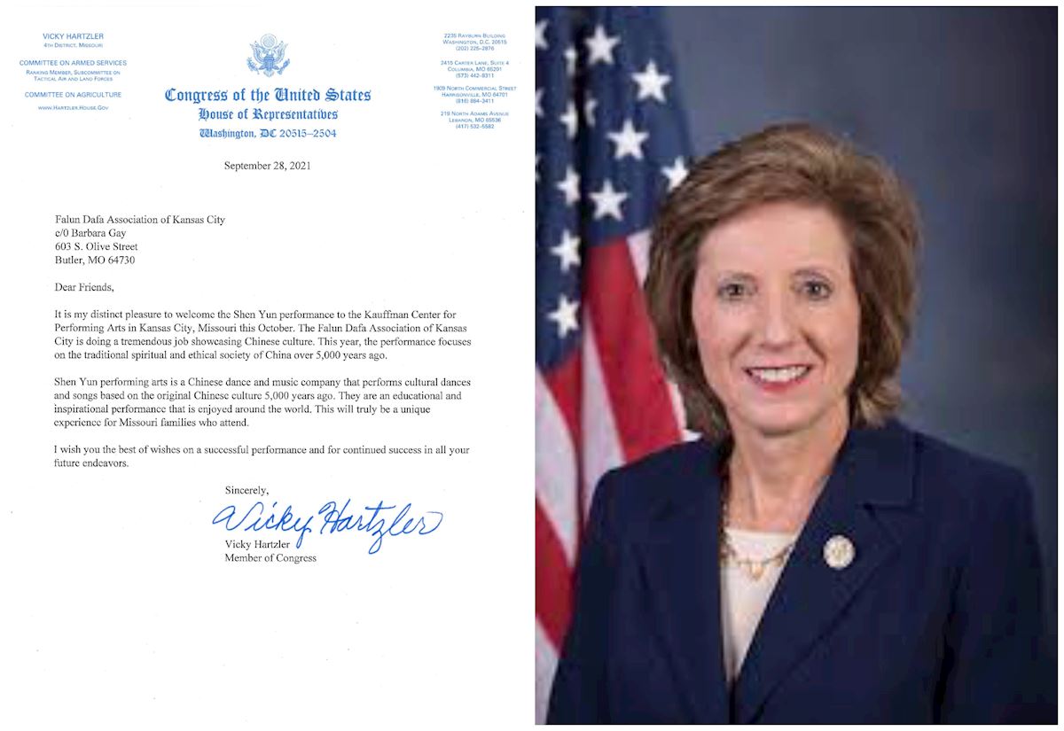 密蘇裏州共和黨眾議員薇琪﹒哈茲勒(Vicky Hartzler)是國會議員。她在賀信稱讚演出主辦方──堪薩斯城法輪大法學會「在展現中國文化方面做出巨大貢獻」。