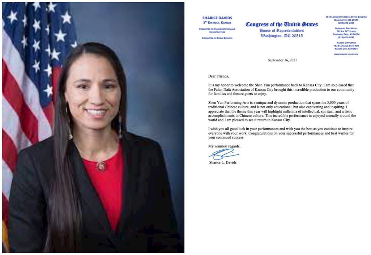 密蘇裏州眾議員莎莉絲﹒戴維茲(Sharice Davids)在賀信中表示,「我很高興堪薩斯城法輪大法學會將這台世界頂尖絕美的節目帶到我們社區,讓本市的家庭和劇場演出愛好者得以享受。」「神韻演出是獨一無二且動態活潑的節目,跨越傳統中華文化五千年,不只深具教育意涵,而且引人入勝、啟迪人心。」她盛讚神韻的藝術成就,「今年的演出主題專注於中華文化數千年的智慧、精神與藝術成就,我深表欣賞。這台(神韻)神妙難訴的節目,每年都為全世界觀眾帶來享受。」她祝願神韻藝術家繼續取得佳績,與此同時,「也為以節目啟迪世界大眾的你們送上最好祝福」。