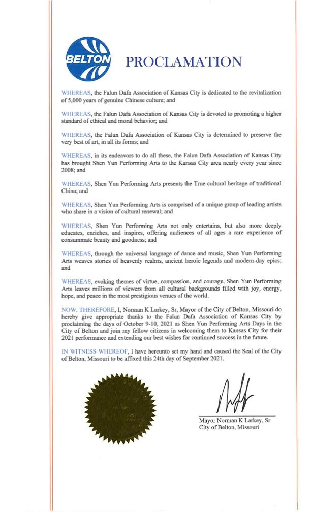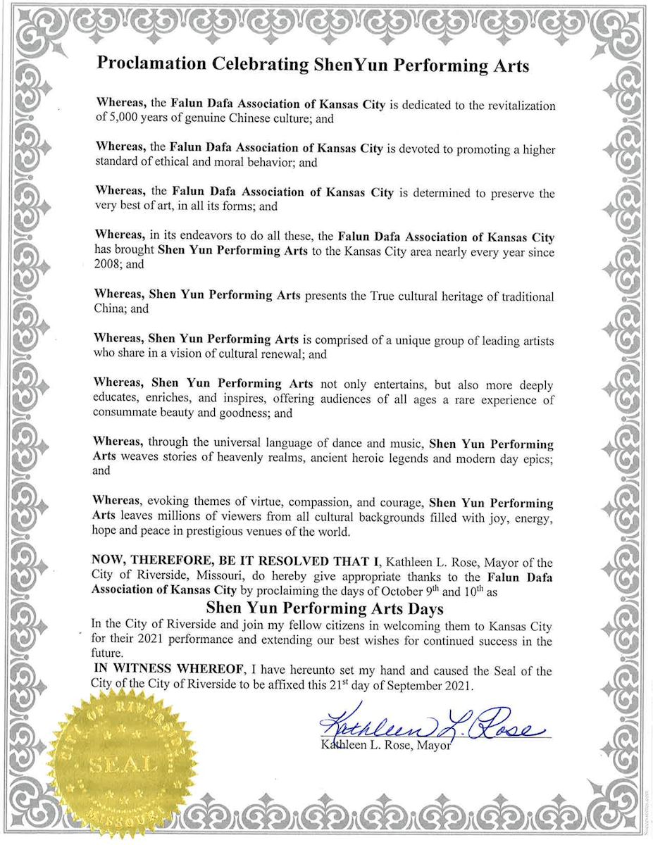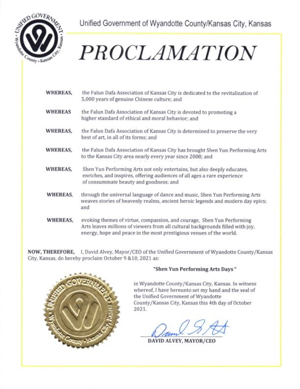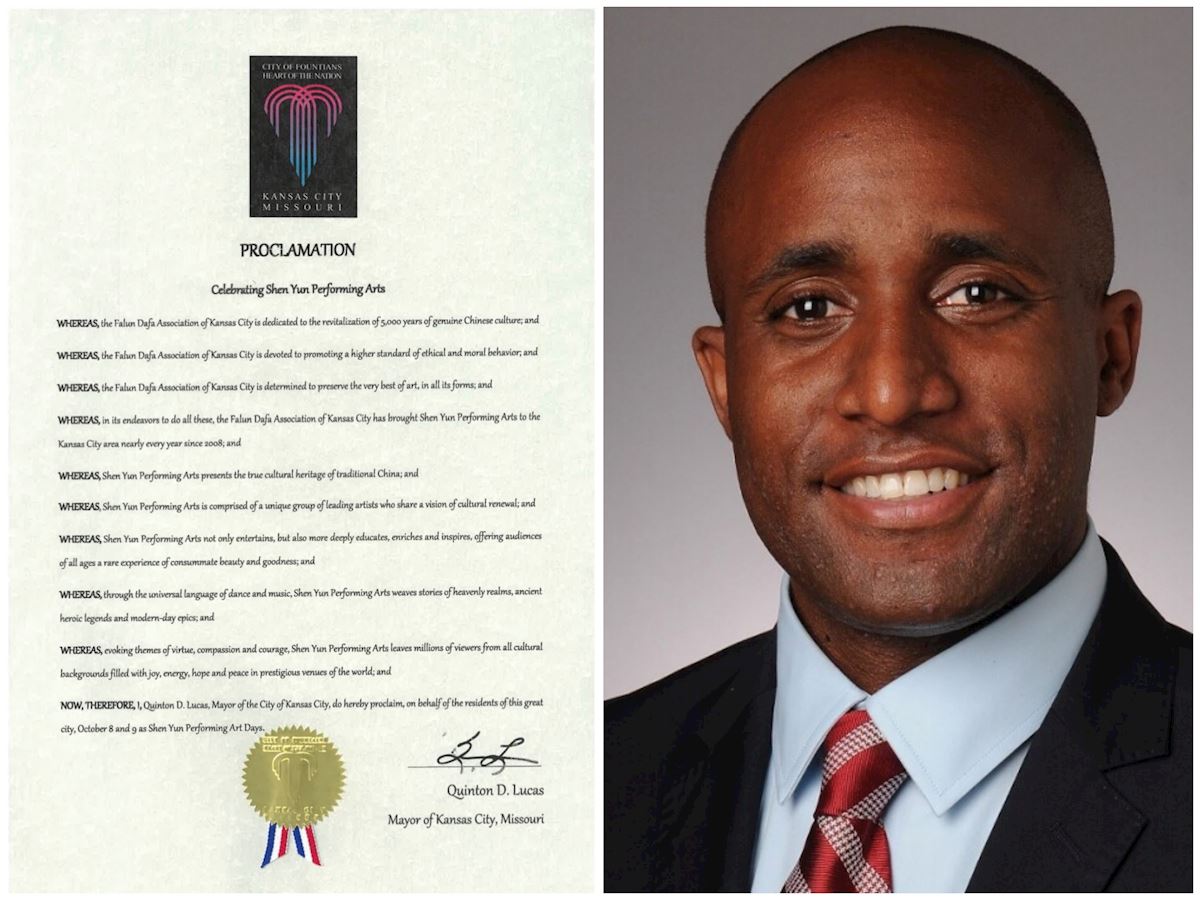堪薩斯城市長昆頓﹒D﹒盧卡斯(Quinton D. Lucas)在「恭賀神韻演出」的褒獎令中感佩地寫道:「堪薩斯城法輪大法學會致力於振興真正的五千年中國文化,致力於促進更高標準的倫理道德品行,並決心保護所有形式藝術的最精華;為實現這些目標,自2008年以來幾乎每年都將神韻演出帶到堪薩斯城地區。