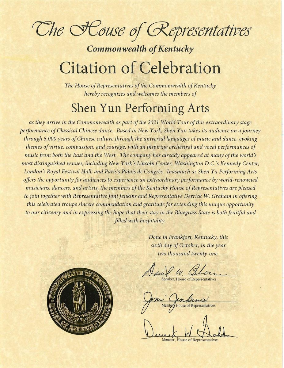 該嘉獎狀中寫道:「肯塔基州眾議員們非常高興能向赫赫有名的(神韻)藝術團發出這份充滿誠意的嘉獎狀,並表達謝意,感謝(神韻)為我們全體市民提供這個獨特的機會;眾議員們希望(神韻藝術家)在藍草州(Bluegrass State)的短暫停留碩果累累,並能感受到民眾的熱情好客。」