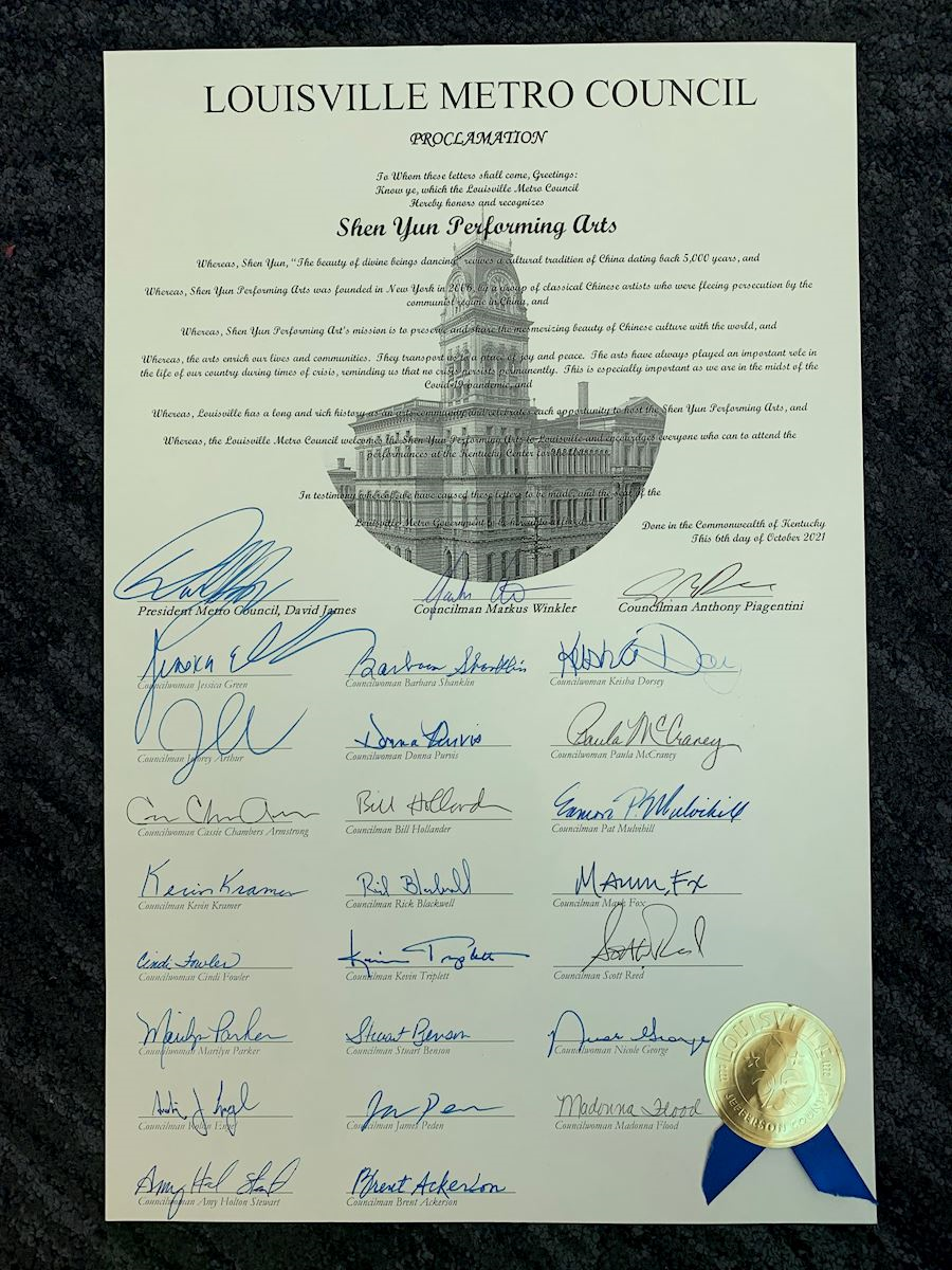 二零二一年十月九日,神韻巡迴藝術團在肯塔基州最大城市路易維爾(Louisville)的肯塔基表演藝術中心(Kentucky Center)上演兩場演出。在神韻抵達的前兩天,肯塔基州眾議院和路易維爾市議會;包括路易維爾市長在內多位政要在褒獎與賀信中向神韻表達感激之情。二十六名市議員則一致鼓勵所有市民都盡可能去觀賞神韻。