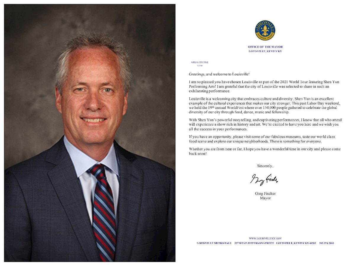 肯塔基州路易維爾市市長格雷格﹒菲捨爾(Greg Fischer)發出賀信恭賀神韻蒞臨路易維爾。賀信中寫道:「我非常高興路易維爾被選做神韻藝術團二零二一年世界巡迴的其中一站!我非常感激路易維爾市被(神韻)選中,上演如此令人振奮的演出。」