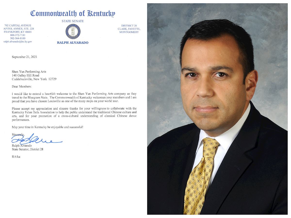 肯塔基州參議員拉爾夫﹒阿爾瓦拉多(Ralph Alvarado)在賀信中寫道:「我非常高興能向神韻藝術團表達我最衷心的歡迎。肯塔基州歡迎(神韻的)成員,你們(神韻)將路易維爾選為你們全球巡演的其中一站,讓我倍感自豪。」他還寫道:「請接受我的感激和由衷的感謝,謝謝你們志願與肯塔基法輪大法學會一道,讓民眾了解傳統的中國文化和藝術;謝謝你們推廣這一跨越文化的傳統中國舞蹈演出。」