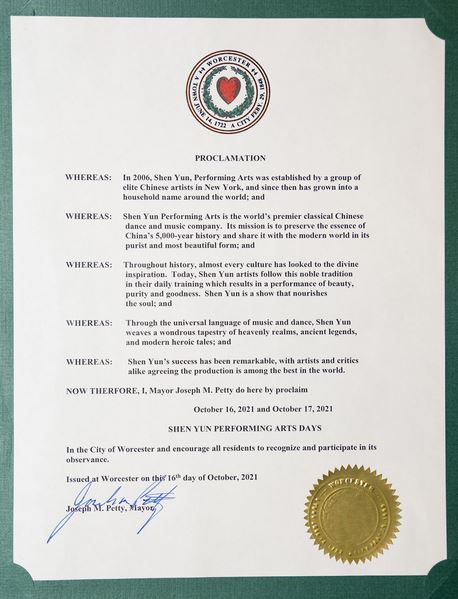 因此:我,市長約瑟夫‧M‧佩提在此宣布,二零二一年十月十六日和二零二一年十月十七日是伍斯特市的神韻藝術團日,並鼓勵所有居民關注並參與觀賞。