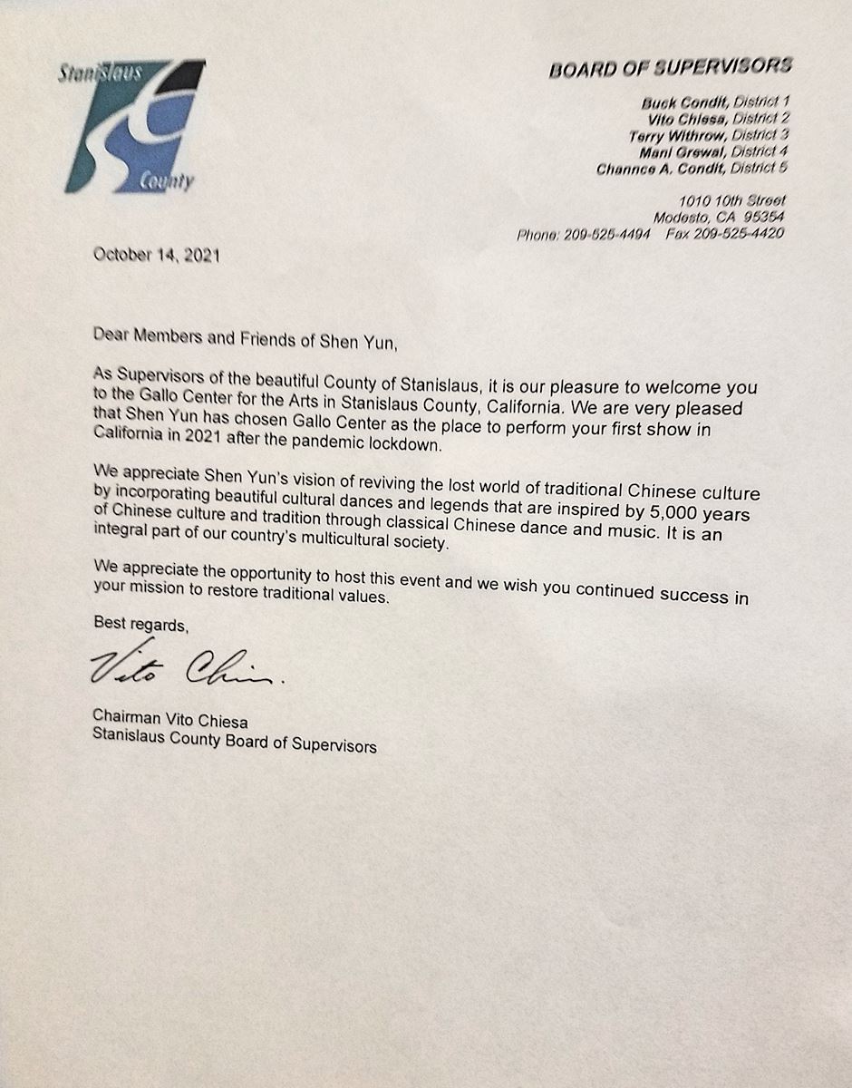 神韻藝術團蒞臨加州莫德斯托演出前,當地縣議會──斯坦尼斯勞斯縣(Stanislaus County)議會給演出主辦方發賀信,為能成為神韻二零二一巡迴演出的加州首站而感到榮幸,並讚賞神韻藝術團通過中國古典舞及音樂展現了中華五千年的傳統及文化。
