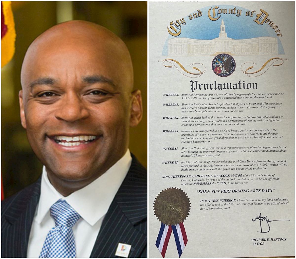 他說,丹佛市歡迎神韻藝術團再次來丹佛演出。希望演出能為丹佛人帶來美好和啟迪。他宣布二零二一年十一月四日至七日為「神韻日」。
