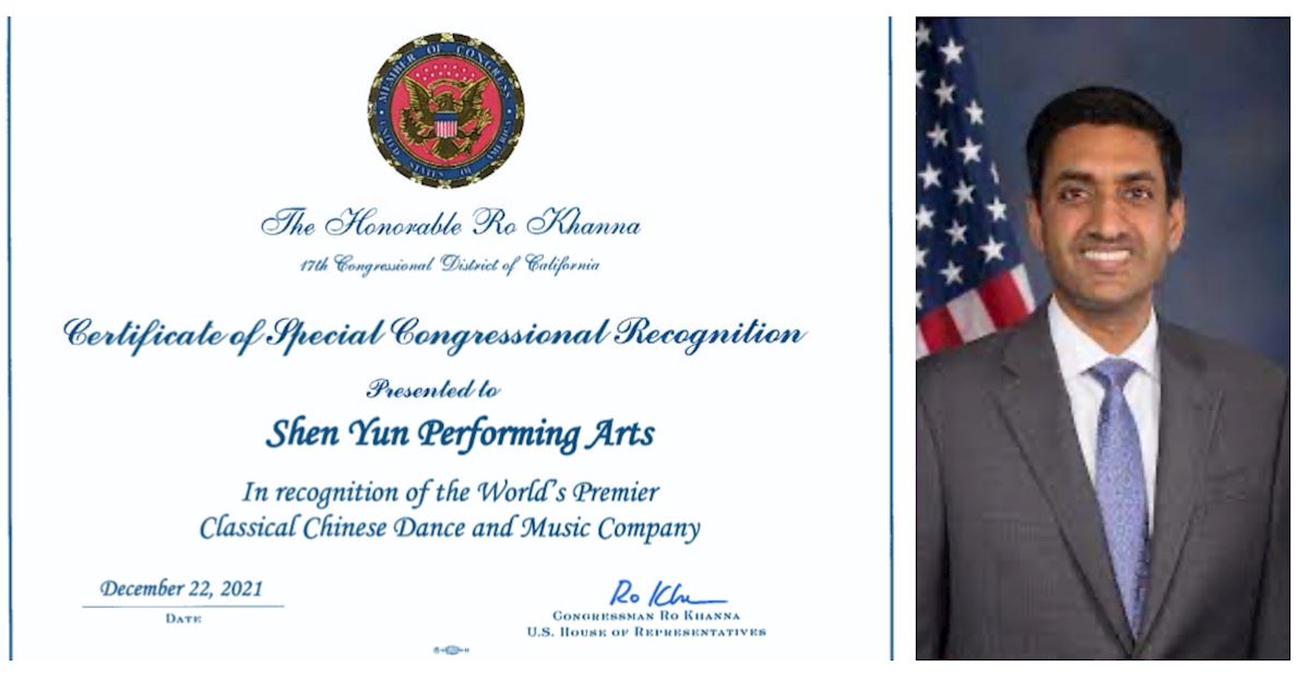 '圖7:國會眾議員羅﹒卡恩納(Ro Khann)在褒獎中,表彰「神韻藝術團是世界首屈一指的中國古典舞和音樂藝術團。」(明慧網合成圖片)'