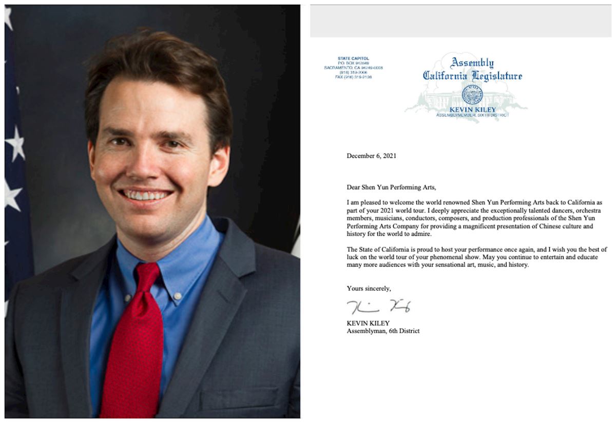 '圖8:加州眾議員凱文﹒基利(Kevin Kiley)在賀信中說,歡迎世界著名的神韻藝術團重返加州。(明慧網合成圖片)'
