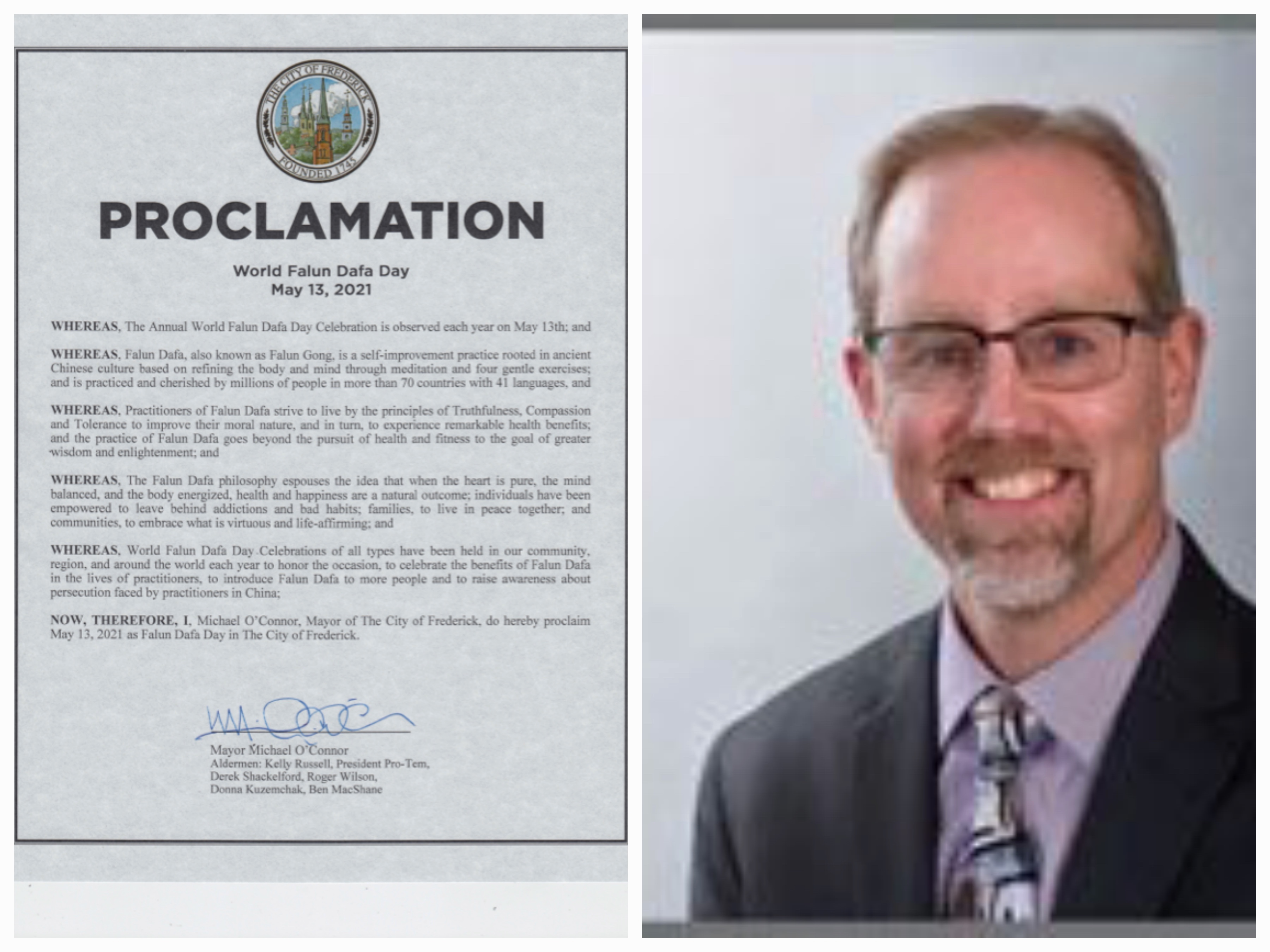 ![]() 圖:美國馬裏蘭州弗雷德裏克市市長邁克爾﹒奧康納(Michael O』Connor)將二零二一年五月十三日定為弗雷德裏克市「法輪大法日」。 |